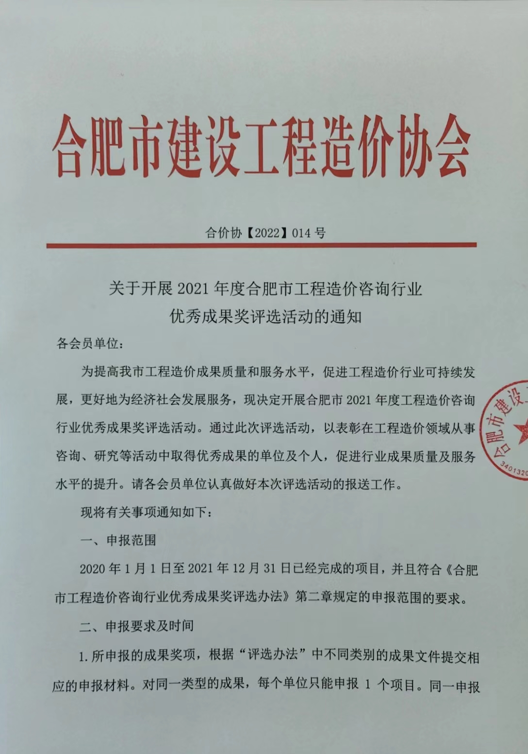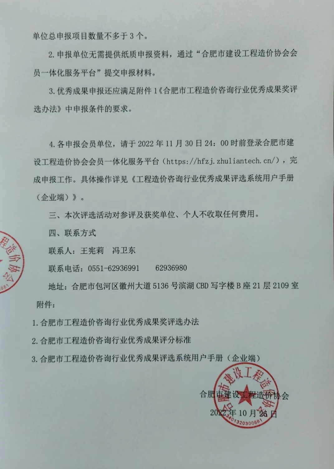 下載文件: 附件1 合肥市工程造價咨詢行業(yè)優(yōu)秀成果評選辦法.docx 附件2評分標(biāo)準(zhǔn).pdf 附件3 網(wǎng)上申報(bào)系統(tǒng)說明.pdf