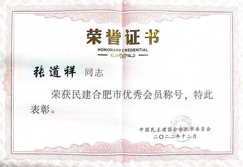 中國民主建國會合肥市委員 張道祥榮獲 2022年“優(yōu)秀會員”