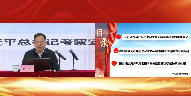 報(bào)告會(huì)上,張彪團(tuán)長(zhǎng)緊扣主題,以充分認(rèn)識(shí)習(xí)近平總書記考察安徽重要講話的重大意義方面;深刻領(lǐng)會(huì)習(xí)近平總書記考察安徽重要講話精神的豐富內(nèi)涵部分;以及切實(shí)推動(dòng)習(xí)近平總書記考察安徽重要講話精神落地生根三個(gè)重要方面進(jìn)行了深入闡述。