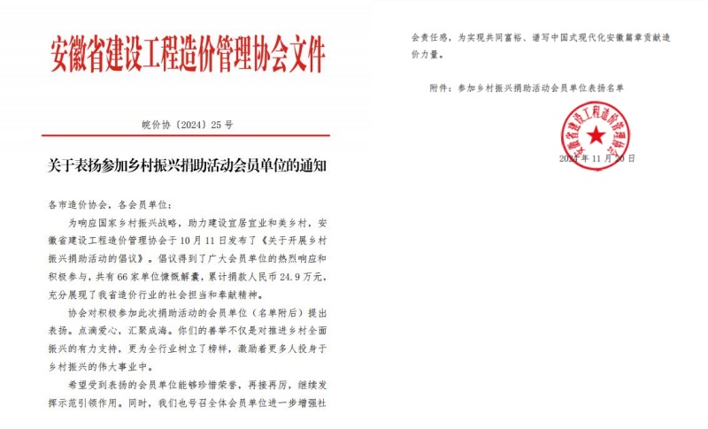 11月22日,安徽省建設(shè)工程造價(jià)管理協(xié)會(huì)(以下簡稱協(xié)會(huì))下發(fā)了《關(guān)于表揚(yáng)參加鄉(xiāng)村振興捐助活動(dòng)會(huì)員單位的通知》,集團(tuán)公司榮獲表揚(yáng)。