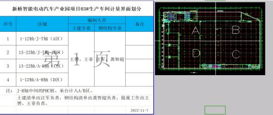 因本項目招標時間緊,任務重,單體體量大,按照傳統(tǒng)清單編制模式,難以在規(guī)定的時間里完成工程量清單與最高投標限價編制任務。集團造價分管領導及部門負責人高度重視,成立項目保障小組,部門負責人親自掛帥。在項目調度會上,部門負責人分析項目難點,創(chuàng)新提出對單體體量最大的生產車間土建專業(yè)進行拆分為4個區(qū)域,配備4名業(yè)務能力和責任心“雙強 ”的人員協(xié)同完成該單體樓的工程量清單及最高投標限價編制任務。其中2名工程師負責鋼結構部分算量,另外2名工程師負責除鋼結構以外土建部分算量,清單編制也是拆分為土建清單和鋼結構清單分別進行編制。4名工程師各自完成2個區(qū)域的工作任務,計算的過程中進行相互探討,確保計算口徑統(tǒng)一,交界面清晰。