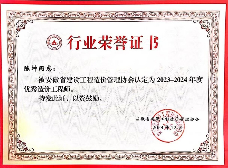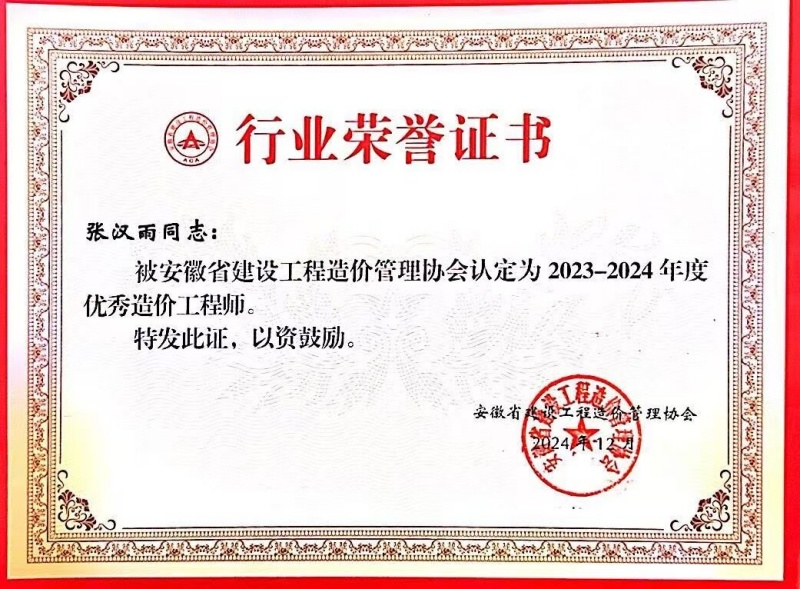 與此同時(shí),合普集團(tuán)員工張漢雨、陳坤憑借自身扎實(shí)的專業(yè)知識(shí)、豐富的實(shí)踐經(jīng)驗(yàn)以及對造價(jià)工作的高度敬業(yè)精神,榮獲 “優(yōu)秀造價(jià)工程師” 稱號(hào)。