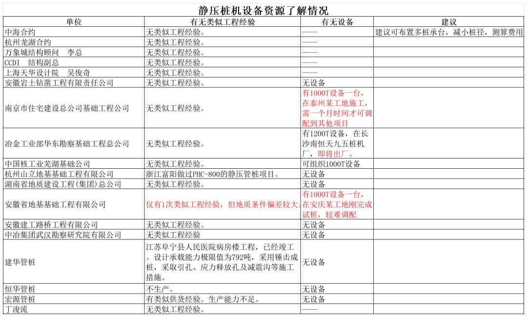 因方案設(shè)計單樁承載能力較高,對靜壓管樁施工設(shè)備要求較高,經(jīng)對原有合作單位、設(shè)計單位、顧問等資源進行了解,目前合肥及周邊市場無閑置可立即進場的1100T以上設(shè)備,考察的2臺設(shè)備均為1000T靜壓樁機設(shè)備,項目部判斷1000T設(shè)備難以滿足承載要求,且基本均在使用狀態(tài),無法任意調(diào)配,工程可采購性較差。