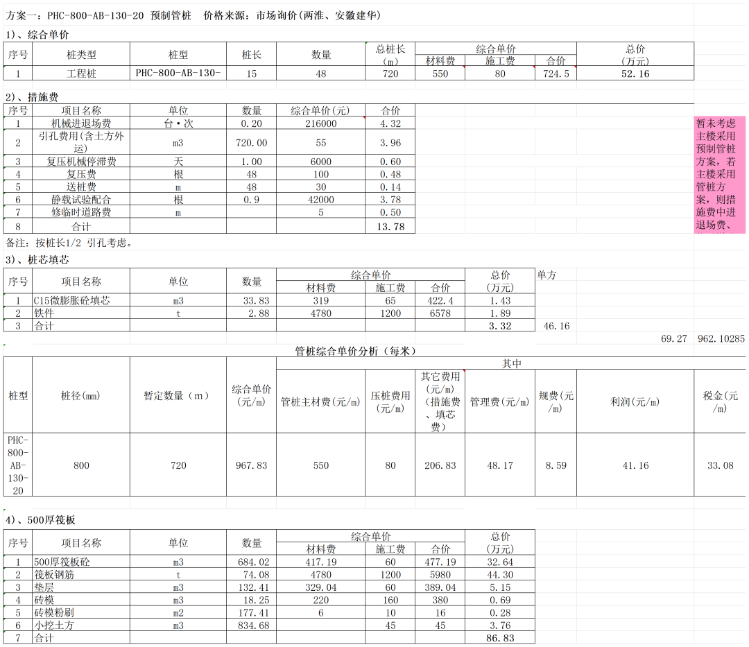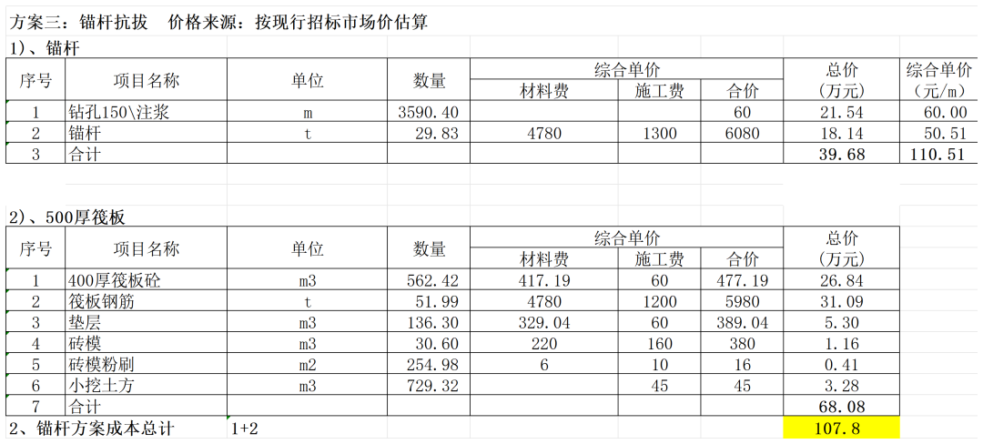 根據(jù)設(shè)計院提供的方案,就抗拔錨桿、預(yù)制管樁、人工萬挖孔樁三種方案經(jīng)濟性比較如下: