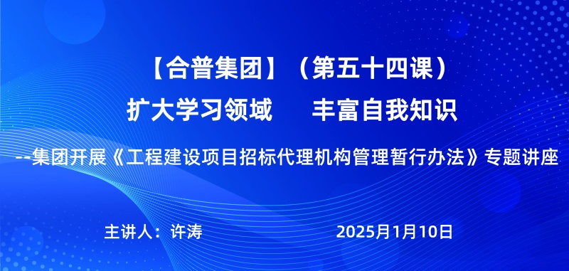 1月10日,合普課堂第五十四期由招標(biāo)部許濤主講,圍繞《工程建設(shè)項(xiàng)目招標(biāo)代理機(jī)構(gòu)管理暫行辦法》進(jìn)行了專題講解。此次課程重點(diǎn)解讀了該辦法對(duì)招標(biāo)代理機(jī)構(gòu)及其從業(yè)人員的管理要求,旨在幫助企業(yè)進(jìn)一步規(guī)范招標(biāo)代理行為、提升招標(biāo)采購(gòu)工作的合規(guī)性與專業(yè)性。