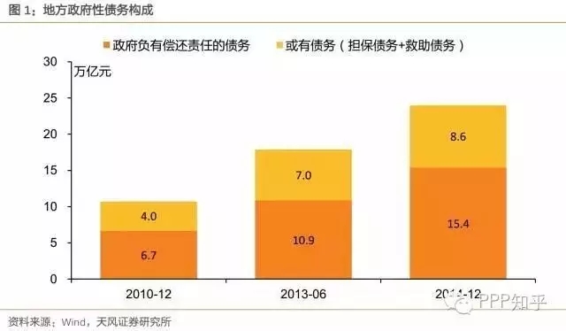 2014年最后一次地方政府債務(wù)審計(jì)結(jié)果顯示,截止到2014年12月31日,地方政府性債務(wù)余額是24萬億,其中包含地方政府負(fù)有償還責(zé)任的債務(wù)15.4億元,或有債務(wù)是8.6萬億。