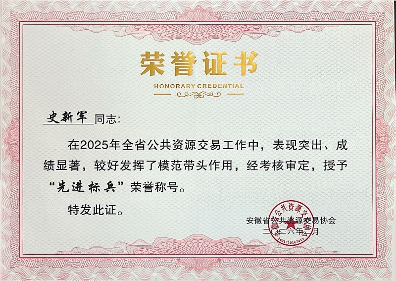 此外,招標(biāo)部經(jīng)理史新軍因在2025年全省公共資源交易工作中表現(xiàn)突出、成績顯著,較好發(fā)揮了模范帶頭作用,經(jīng)考核審定,被授予“先進(jìn)標(biāo)兵”榮譽(yù)稱號。