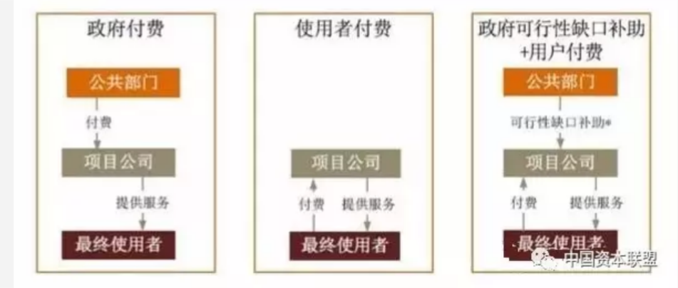 第三種:使用者向項(xiàng)目公司支付一定費(fèi)用,項(xiàng)目公司為使用者提供比較優(yōu)惠的有償服務(wù),同時(shí)政府給予項(xiàng)目公司一定的補(bǔ)貼,以彌補(bǔ)其經(jīng)營(yíng)的成本缺口,保證其收益。