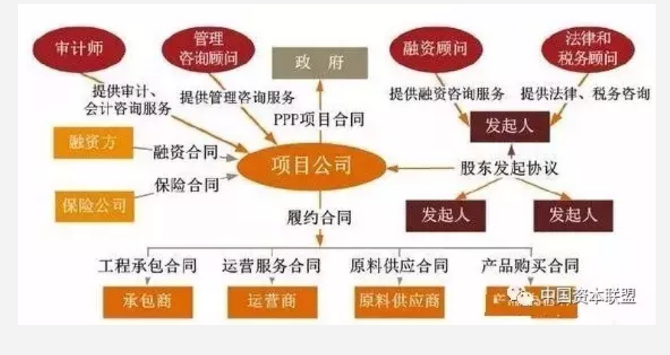 一個(gè)PPP項(xiàng)目中參與主體眾多,要協(xié)調(diào)的關(guān)系也比較復(fù)雜,主要涉及政府、發(fā)起方、項(xiàng)目公司、融資方、擔(dān)保方、具體的項(xiàng)目執(zhí)行伙伴包括承包商、運(yùn)營(yíng)商、供應(yīng)商以及外圍提供各位咨詢服務(wù)的主體如審計(jì)師、融資顧問(wèn)、法律和稅務(wù)顧問(wèn)等。在眾多主體中,項(xiàng)目公司是執(zhí)行的核心,各方的關(guān)系要通過(guò)完善的合同體系對(duì)責(zé)權(quán)利進(jìn)行明確的劃分。